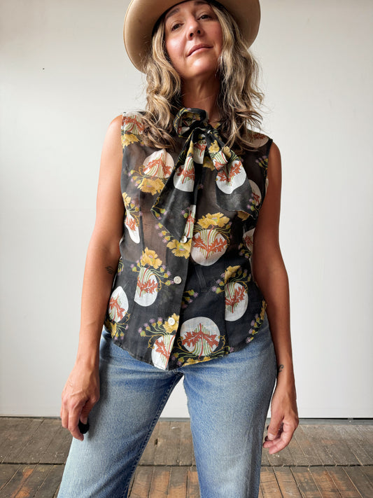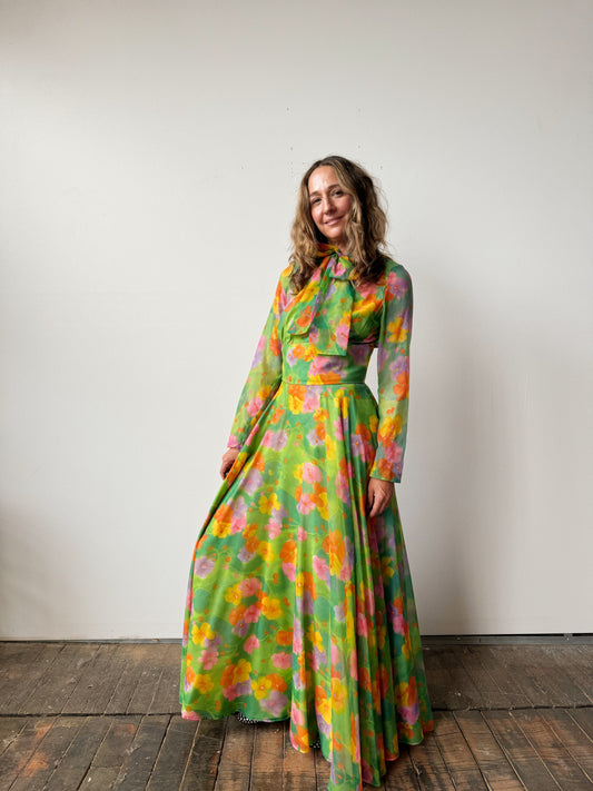 30s Silk Acetate Floral Dress with Velvet Ribbon (S)