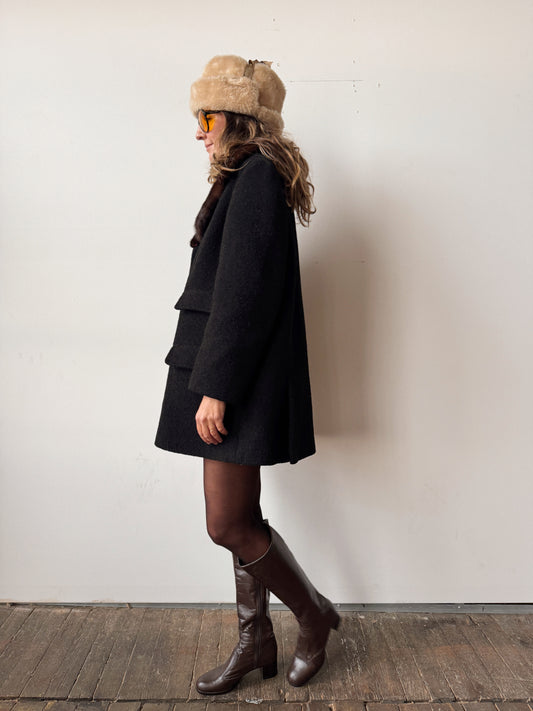 60s Wool Button Coat with Mink Fur Collar (S)