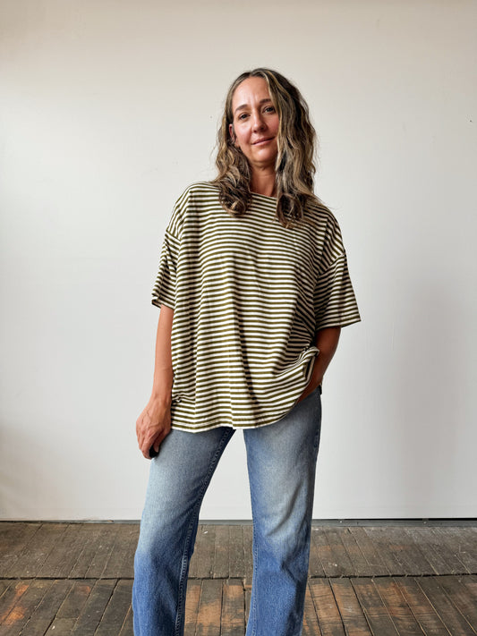 Khaki Stripe Box Tee with Button Sleeve