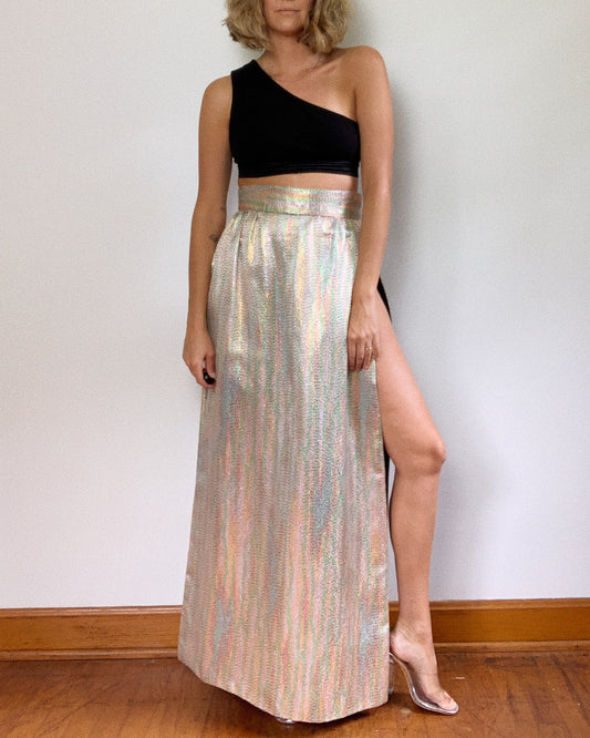 HIGHEST DOUBLE SLIT LAMÉ SKIRT / 27'
