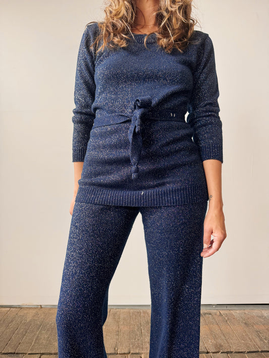60s Navy and Metallic Knit Pant Suit (M)