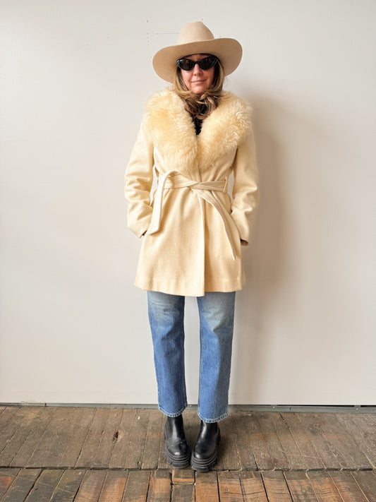 Cream Belted 70s Faux Fur Wool Jacket