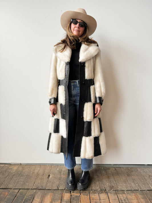 60s Leather and Faux Fur Checkered B&W Coat (M)
