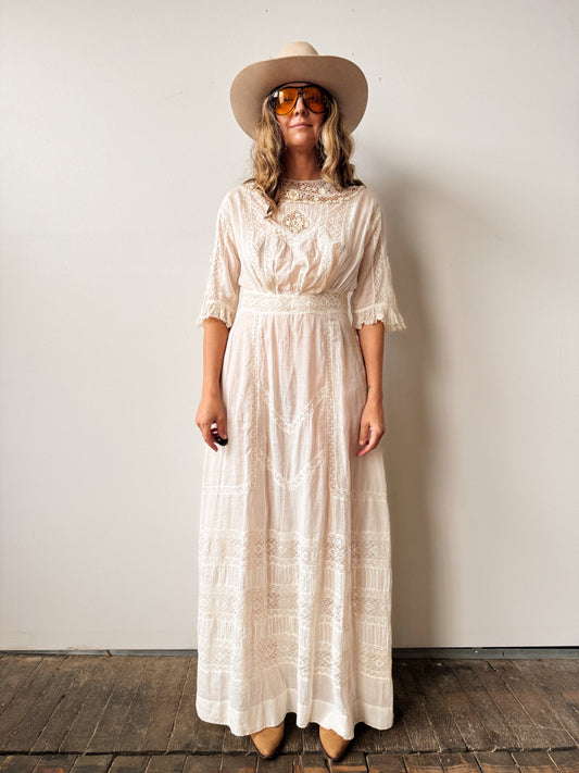 Antique Edwardian 1900s White Cotton Lace Dress (M)