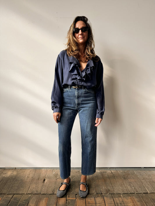 Sold outSilk 90s Navy Ruffle Blouse (M)