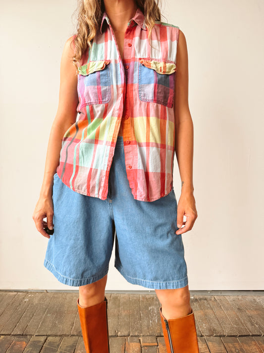 Striped Ruffle Sleeveless 70s Blouse (M)