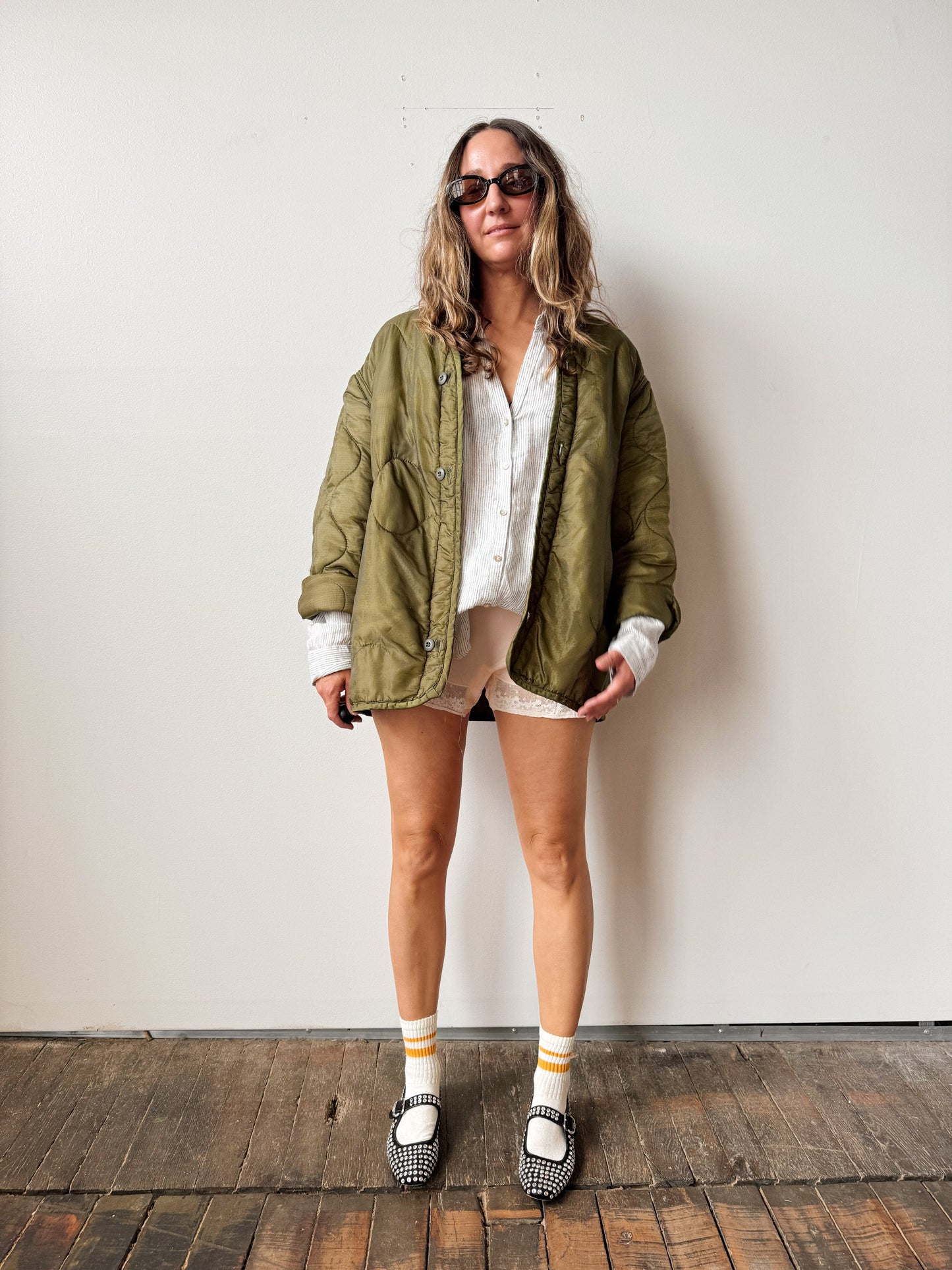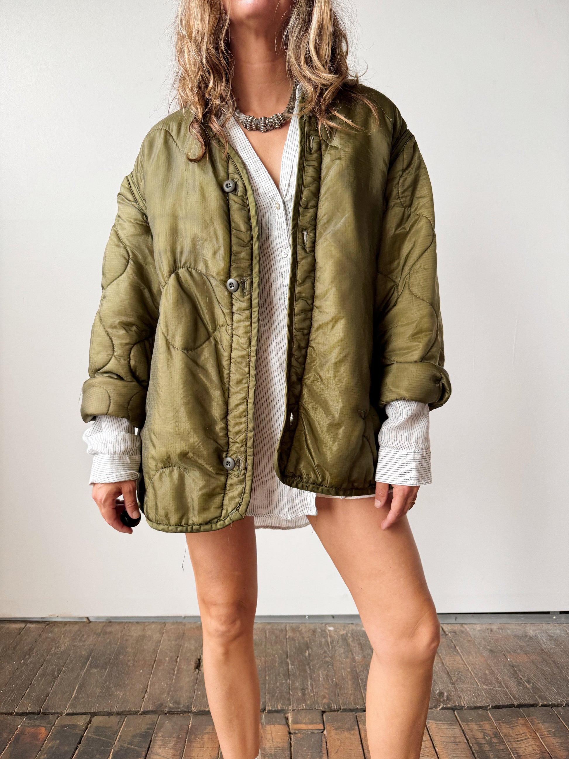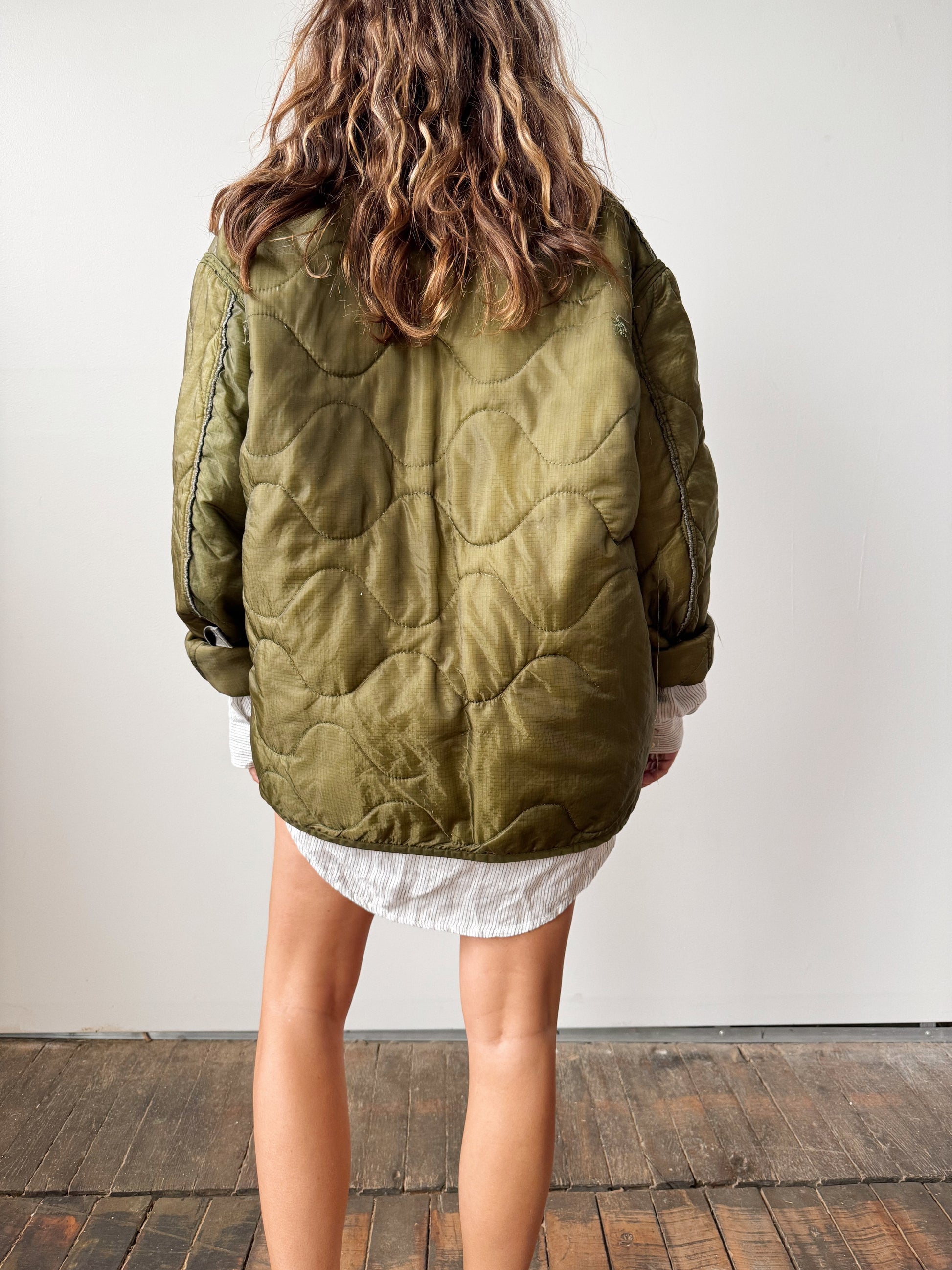 Army Green Liner Jacket Vintage Quilted Nylon Jacket (M)