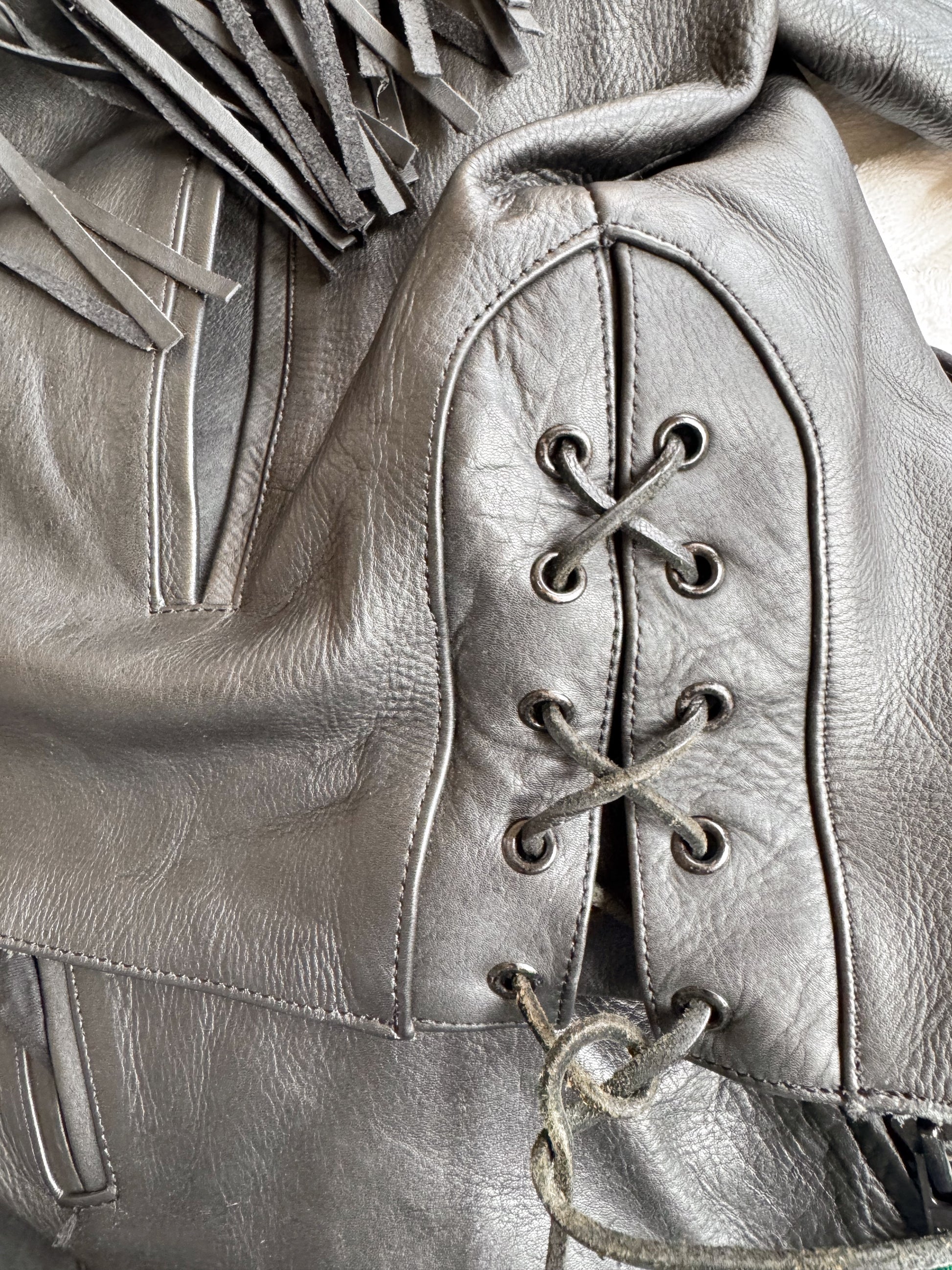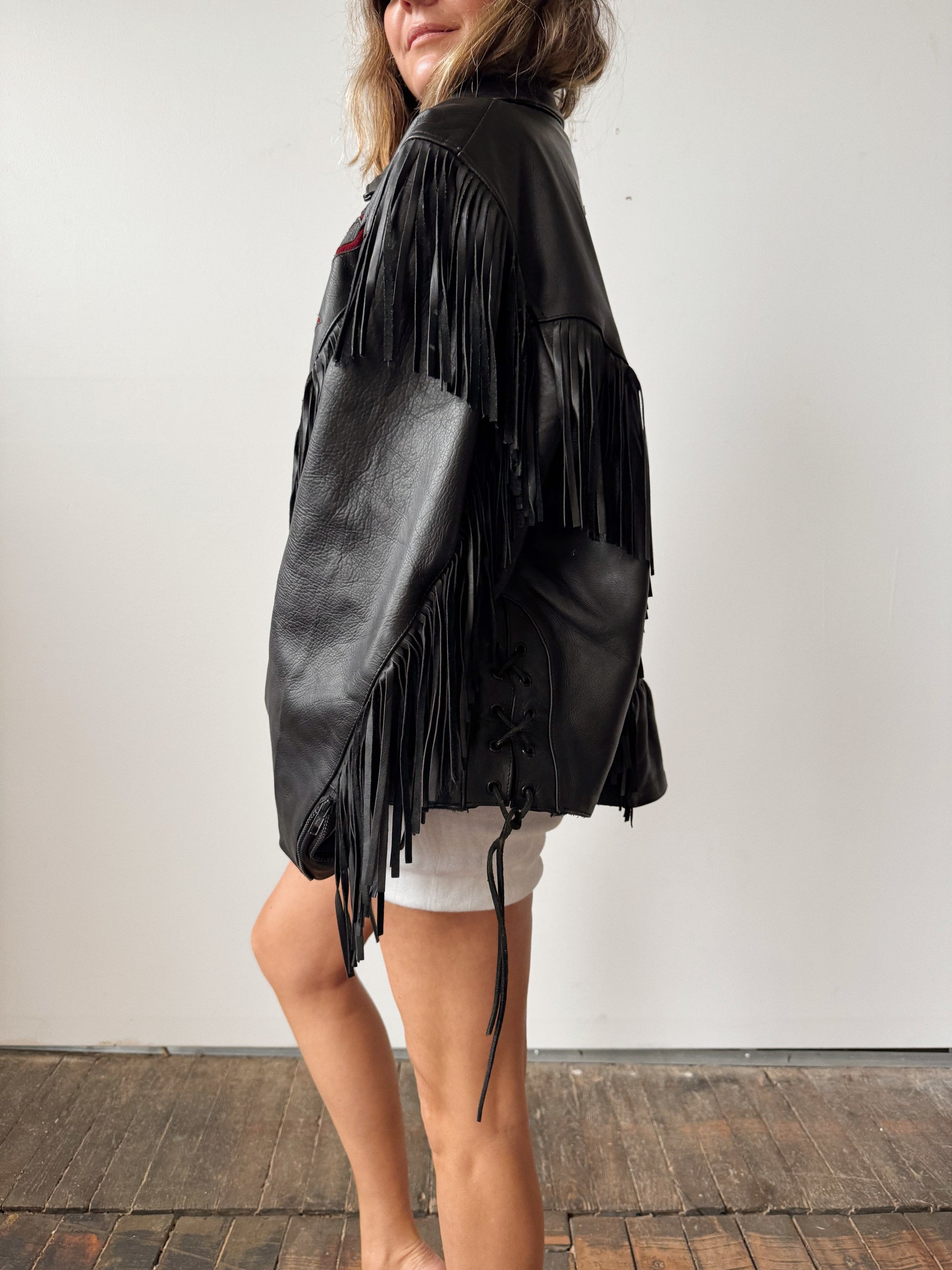 Leather Fringe Motocycle Jacket with Rose Cut-out Details (XL)